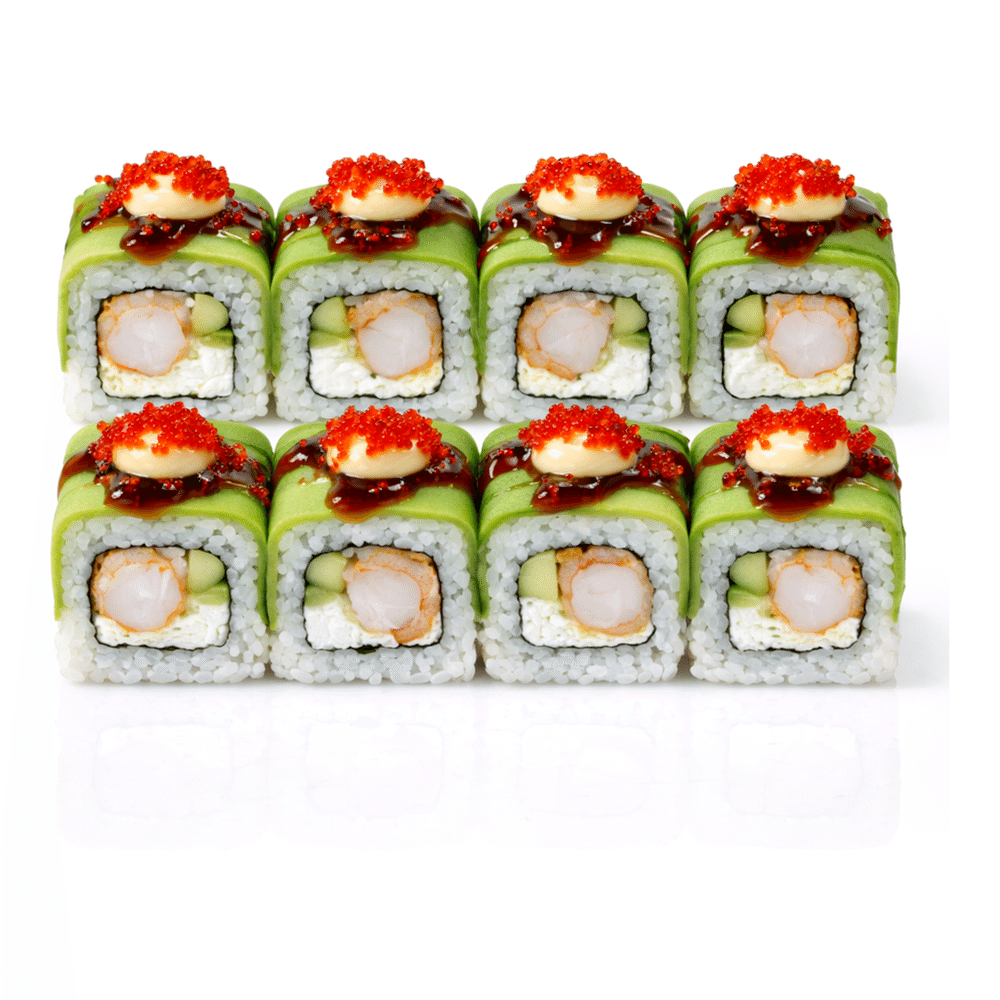 Креветки тигровые темпура, авокадо, сыр сливочный, спайси соус, икра тобико, соус терияки, рис, водоросли нори