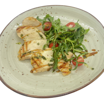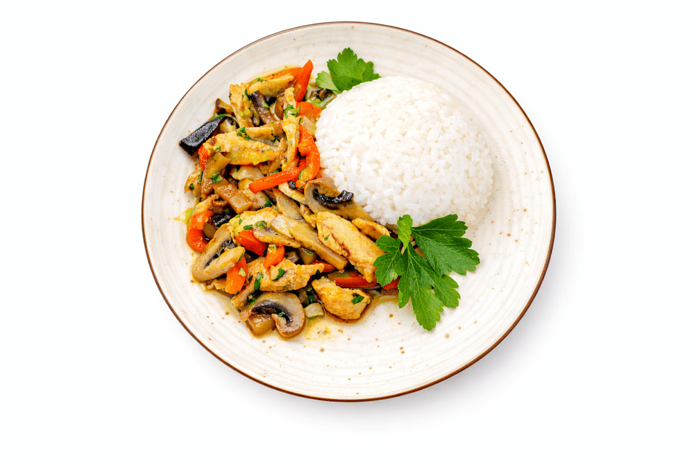 Куриная грудка, перец болгарский красный, баклажан, шампиньоны, соус терияки, зелень, рис.